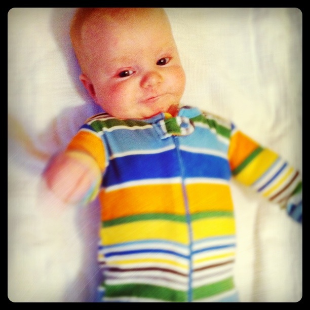 Hey there 4 month old baby! I feel like the time between 3 and 4 months was quite a jump. You already look like a little boy, no longer a newborn, and your personality has shown through. You still are a chunk though with the frists, cankles, and extra rolls around the knees so that's how I know you're still my baby. But you can move and do so much!